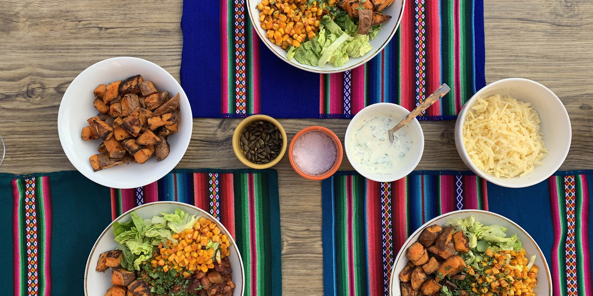 • Take your bowls (which should contain the lettuce) and add the diced sweet potato, followed by the chilli, the smashed avocado and finally, the corn